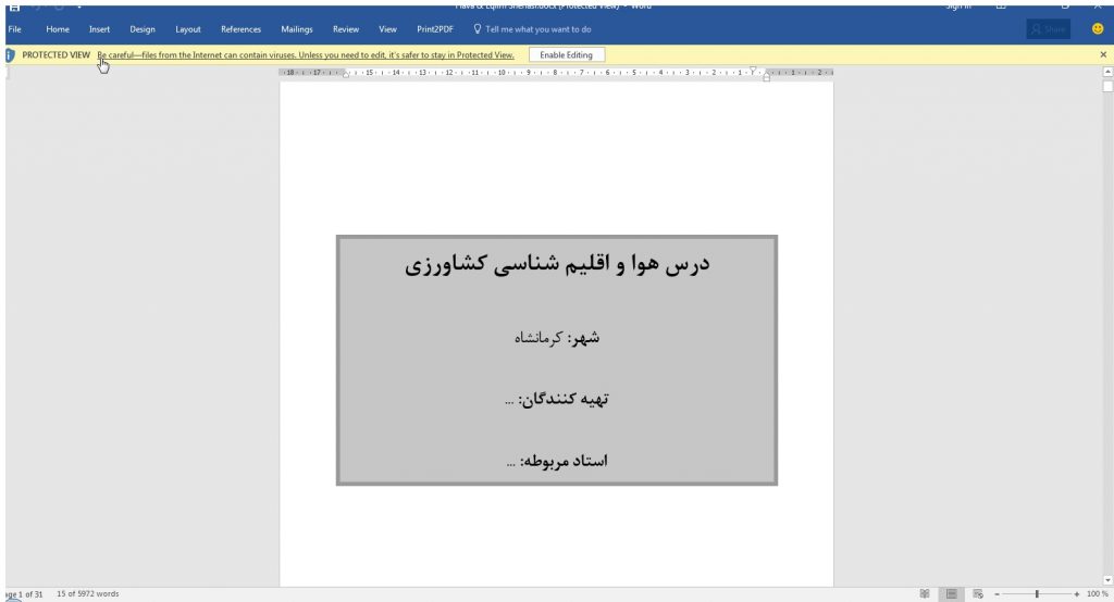 دانلود پروژه کامل درس هوا و اقلیم شناسی کشاورزی شهر کرمانشاه فهرست مطالب فصل اول: مشخصات ایستگاه سینوپتیک ۱ ۱-۱- موقعیت جغرافیایی استان ۱ ۱-۲- اقلیم استان کرمانشاه ۱ ۱-۳- پوشش گیاهی استان کرمانشاه ۲ ۱-۴- مشخصات کلی کشاورزی ۳ فصل دوم: دما ۴ ۲-۱- تمرین ۴ ۲-۱-۱- نمودار ۵ ۲-۱-۲- نتیجه گیری ۵ فصل […]