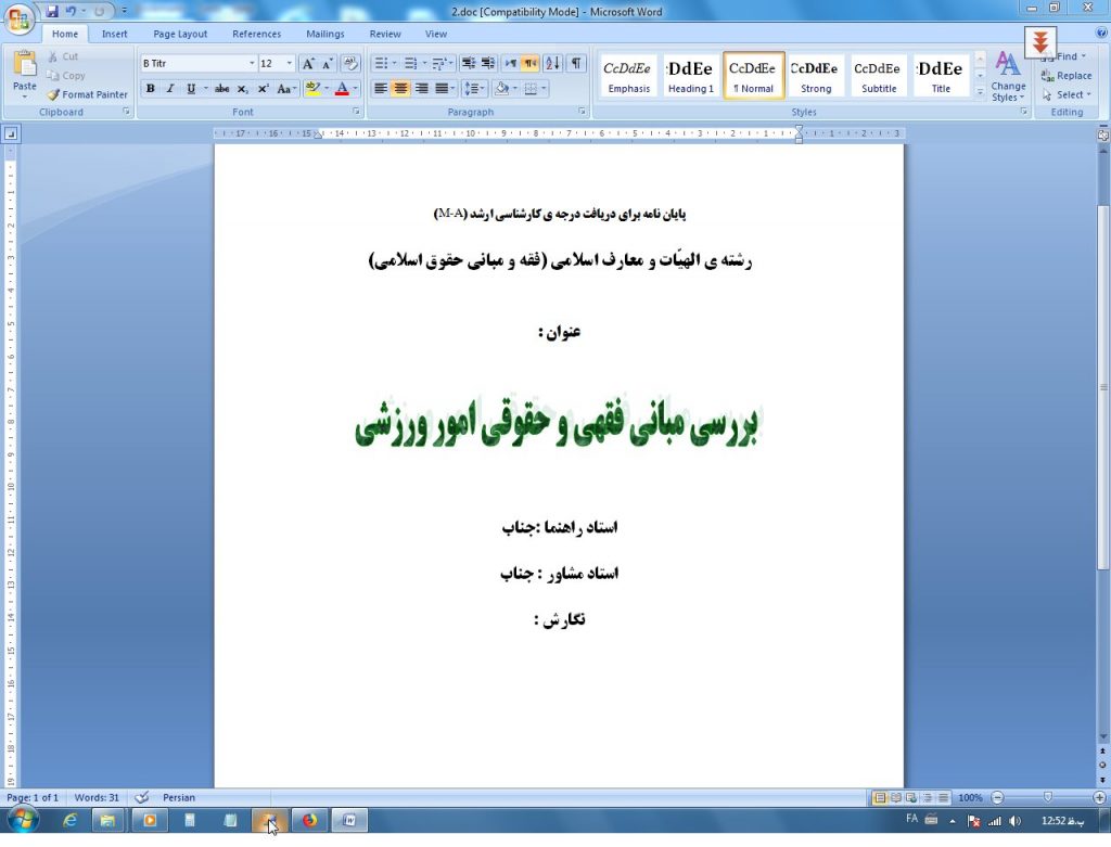 عنوان پایان نامه کارشناسی ارشد یا دکترای حرفه ای: بررسی مبانی فقهی و حقوقیِ امور ورزشی تعداد واحد پایان نامه : ۴ واحد نمره پایان نامه دانشجو به عدد به حروف چکیده : قوانین ورزشی را به دو گروه می توان تقسیم کرد : ۱) گروهی که به قواعد بازی ها اختصاص دارد . […]