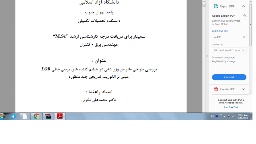 پایان نامه کارشناسی ارشد رشته برق گرایش الکترونیک موضوع پایان نامه سمینار کارشناسی ارشد رشته برق گرایش الکترونیک چکیده باتوجه به مشکلات طراحی ماتریس های وزنی برای LQR، راهکاری مبتنی بر یک الگوریتم تکامل تدیجی چندمنظوره پیشنهاد می گردد. موضوع سمینار بررسي طراحي ماتريس وزن دهي در تنظيم كننده هاي مربعي خطي مبني بر الگوريتم […]