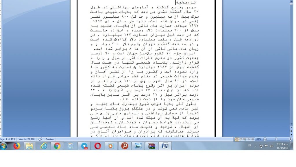 پایان نامه با عنوان بلایای طبیعی تاریخچه مرور وقایع گذشته و آمارهای بهداشتی در طول ۲۰ سال گذشته نشان می دهد که بلایای طبیعی باعث مرگ بیش از سه میلیون و حداقل ۸۰۰ میلیون نفر زخمی در جهان شده است. تنها طی سال های ۱۹۹۶-۱۹۹۷ میلادی خسارت های ناشی از بلایای عظیم به بیش از […]
